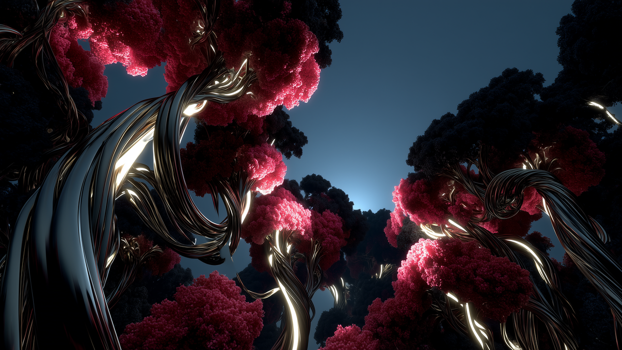 בין עצי יער עתיקים, אור זהוב ופרחים ורודים נוצצים בלילה אפל. חוויה של יוקרה, רוך וקסם מחכה לכם בכל פינה.